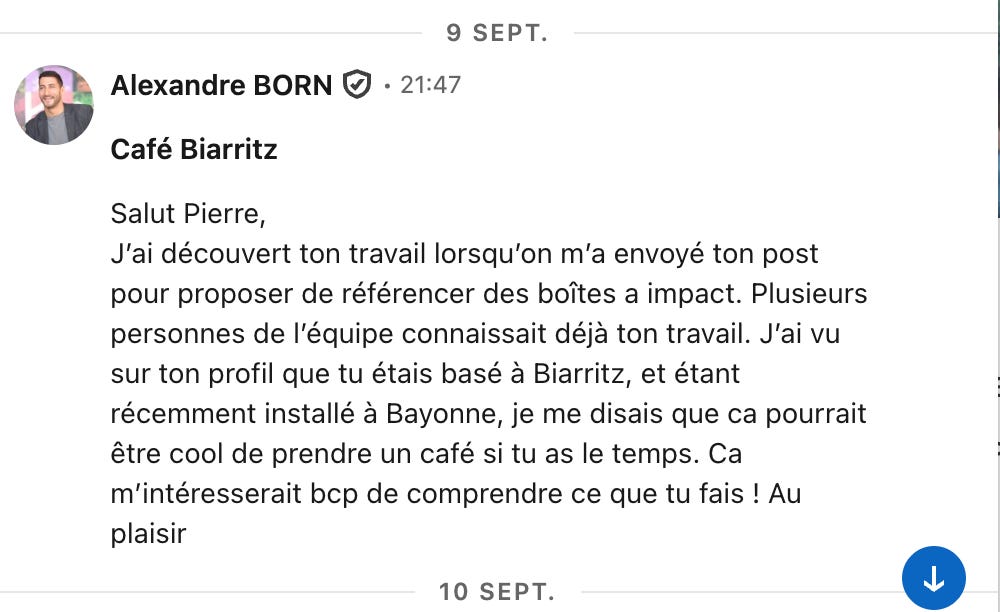 Début septembre, Alexandre Born, le co-fondateur de Bellevilles m’envoie un DM sur LinkedIn pour se rencontrer :